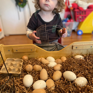 We usually go for a more "bunny" themed table around this time of year, however, this year we opted to use the most adorable crate and brown eggs and cartons from Target's dollar section! These are a bit different than what I would usually do for a sensory table; usually it's more about pouring, scooping, pinching, grasping with fingers and hands.